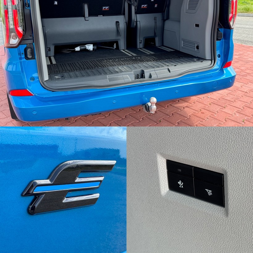 A külső dizájn megtartja a Tourneo Custom jellegzetes, modern vonalait, az elektromos változatra jellemző kék díszítőelemekkel és egy megkülönböztető „E” emblémával. A hosszabbított változat különösen előnyös: