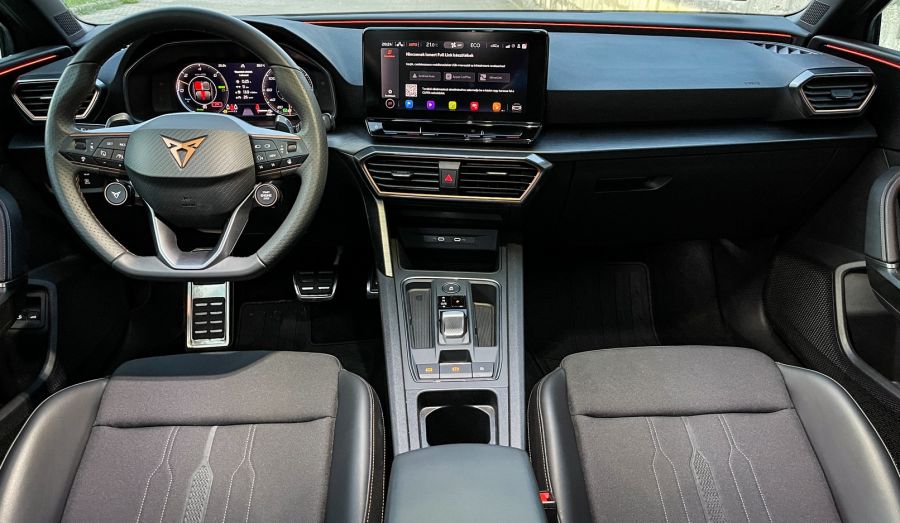 Hogy a sportosság ne csak díszlet legyen, 41 lóerővel többet kap a Cupra vezetője, mintha egy sima Seat Leont vezetne. A párosítás természetesen azonos, egy 1.4 TSI benzinmotor és egy elektromotor párosítása állítja elő az összesen 245 lóerőt, melyet egy 6 fokozatú DSG automata váltó segítségével juttatnak el az első kerekekhez. Mondanom sem kell, kiváló gyorsulási és vezetési élményt kapunk egy látszatra és erős túlzással „átlagos” kombitól. Azt, hogy mennyire sportos az érzés, azt a kormányon elhelyezett Cupra gomb segítségével tudjuk állítani. Nyilván nem meglepetés, hogy a CUPRA üzemmódban jön ki leginkább a spanyol virtus a járműből.