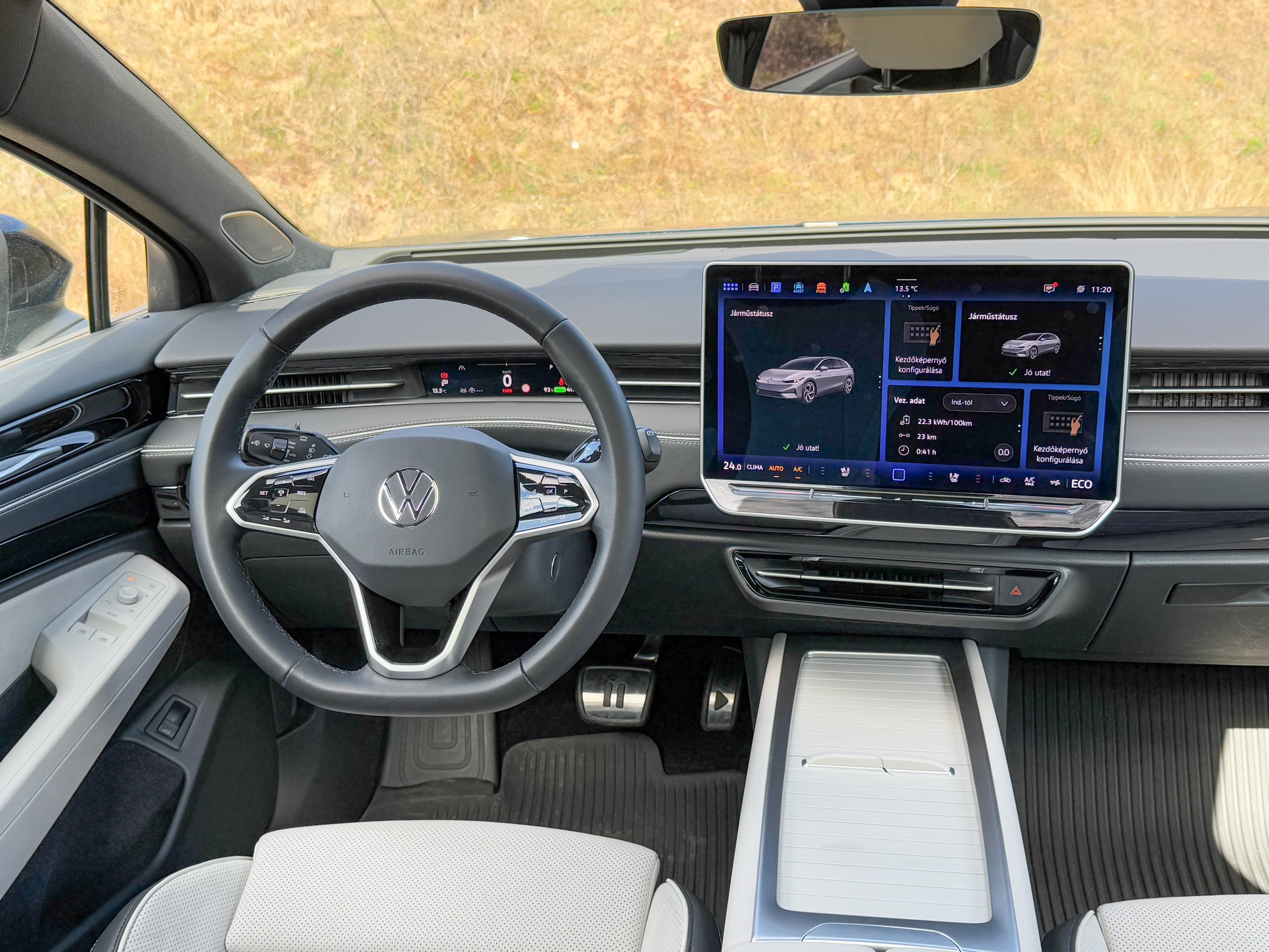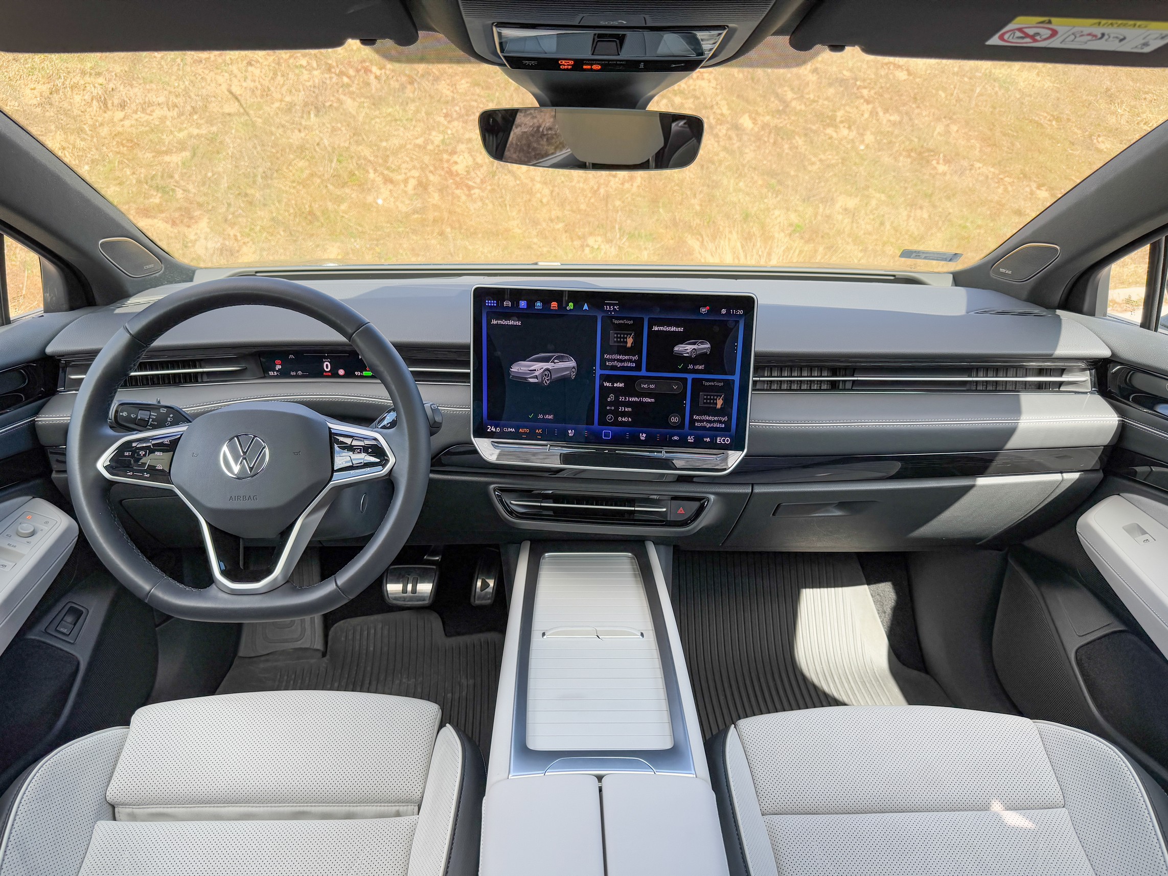 A Volkswagen hagyományosan magas színvonalú autókat készít, és az ID.7 Tourer sem kivétel. A belsejében magas minőségű anyagok dominálnak, amelyek nemcsak esztétikailag kielégítőek, hanem tartósnak is tűnnek. A műanyagok, az alcantara és a fém elemek tökéletes összhangban vannak, és az autó minden részlete gondosan megtervezett. Az ülések kényelmesek, és hosszú utazások során is kiváló komfortot nyújtanak. Az ergonómiai kialakításnak köszönhetően minden gomb, kapcsoló és kijelző pontosan oda van helyezve, ahová szükséges, így a vezetés során minden kéznél van. Bár az újratervezett kezelőszervek elhelyezése egy régebbi VW-modelből átülve megszokást igényelnek.
