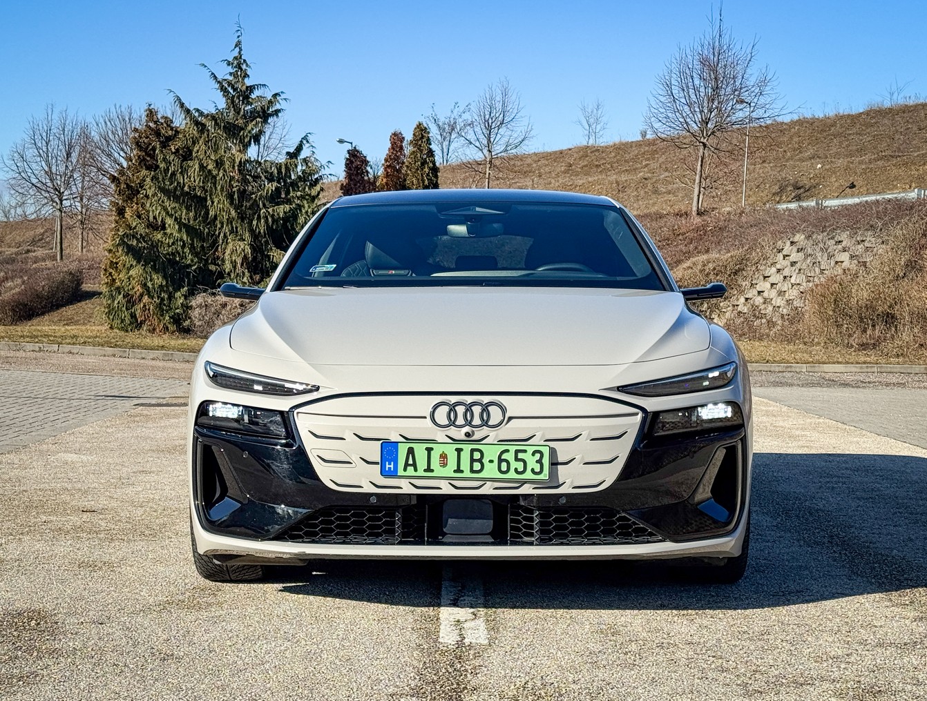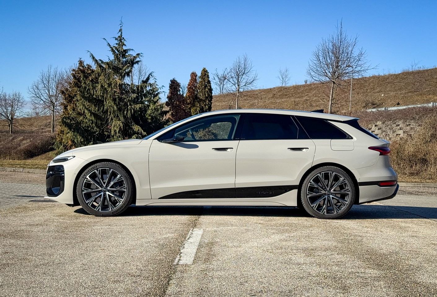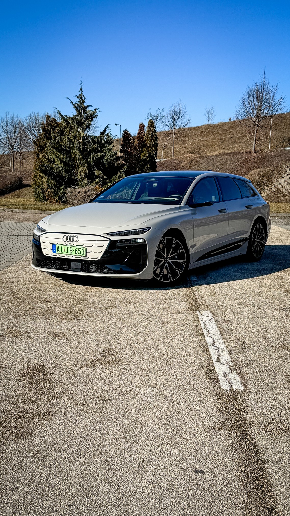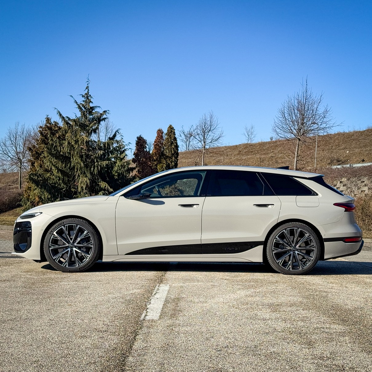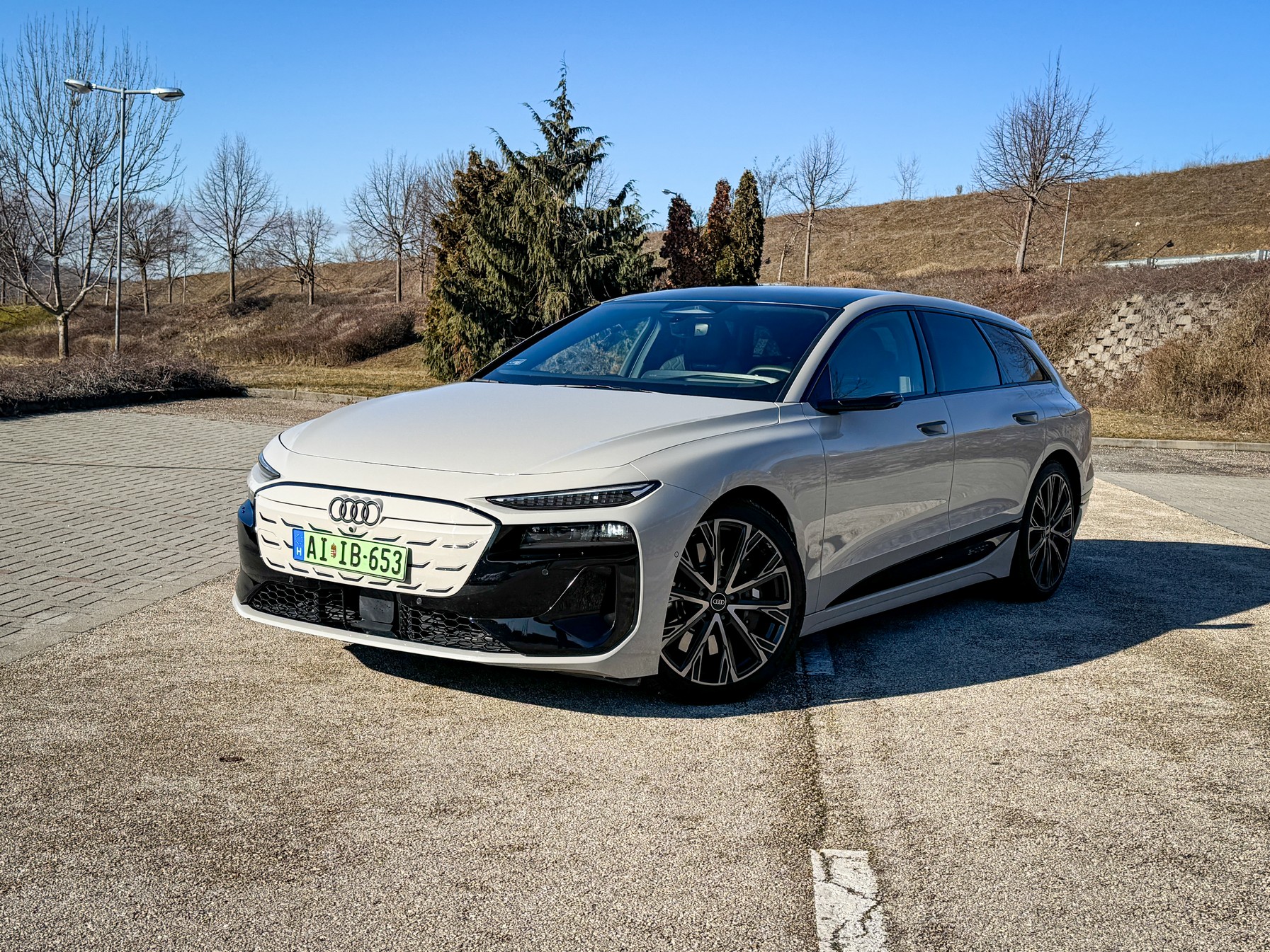 A legfontosabb momentum, amiért már az első métereken hálás voltam: ez az autó egy Avant. Egy igazi, vérbeli kombi. A jelenlegi piacon, ahol minden második újdonság egy magas építésű, olykor bumfordi SUV, felüdülés látni ezt a lapos, nyúlánk és elképesztően elegáns sziluettet. A tesztautónk világosbarna metál fényezése pedig telitalálat. Nem hivalkodó, mégis rendkívül különleges; van benne egyfajta „felnőtt” elegancia, ami kiemeli az autó futurisztikus vonalait.
