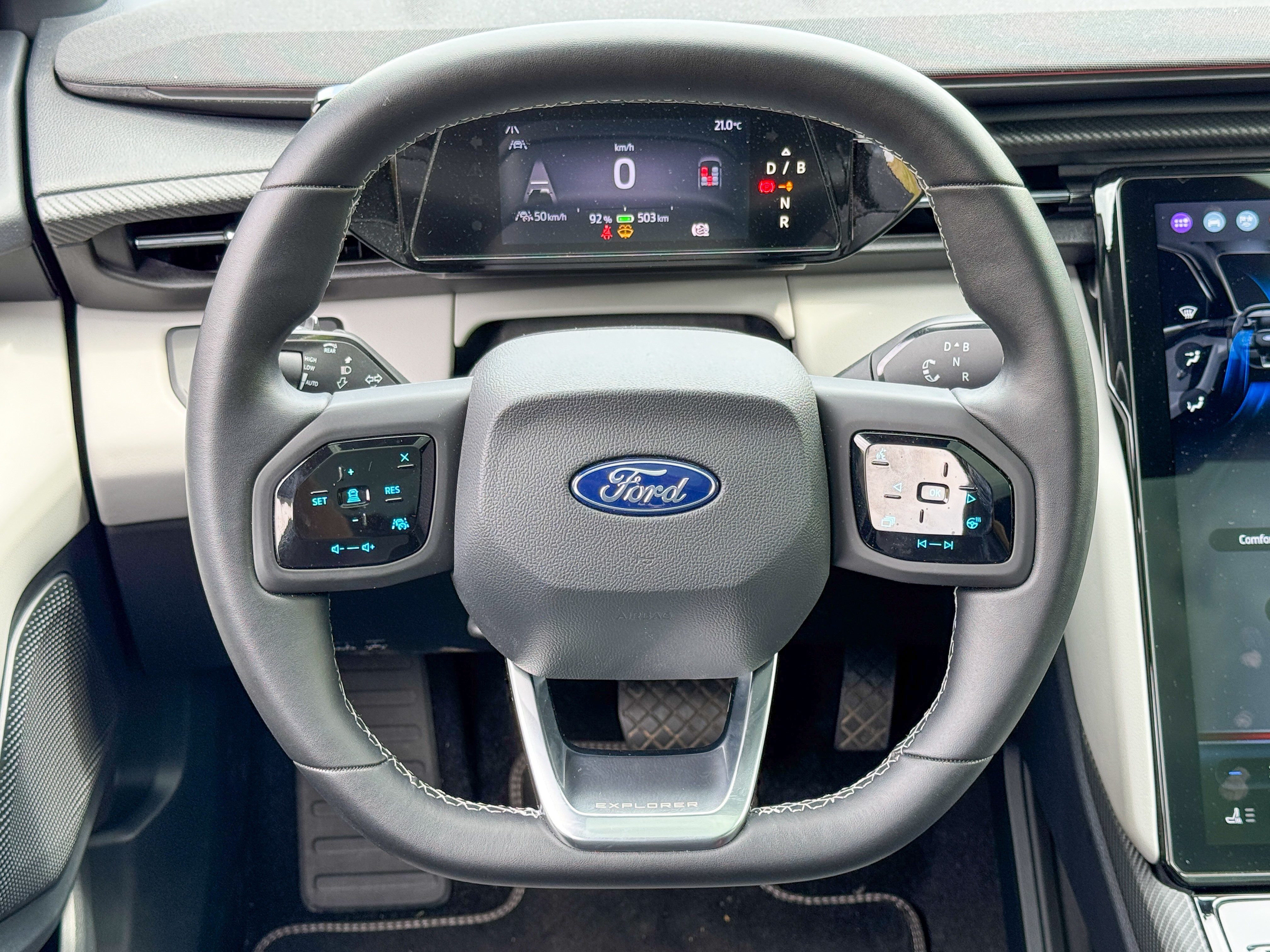 Az Explorer Extended Range nem sportautó, de a pontos kormányzás és a jól szabályozott futómű lehetővé teszi, hogy magabiztosan mozogjon városi és autópályás körülmények között is. A váltókar a kormánykerék mögött jobb kéznél kapott helyet, ami kezdetben újdonságként hat, de hamar megszokható.