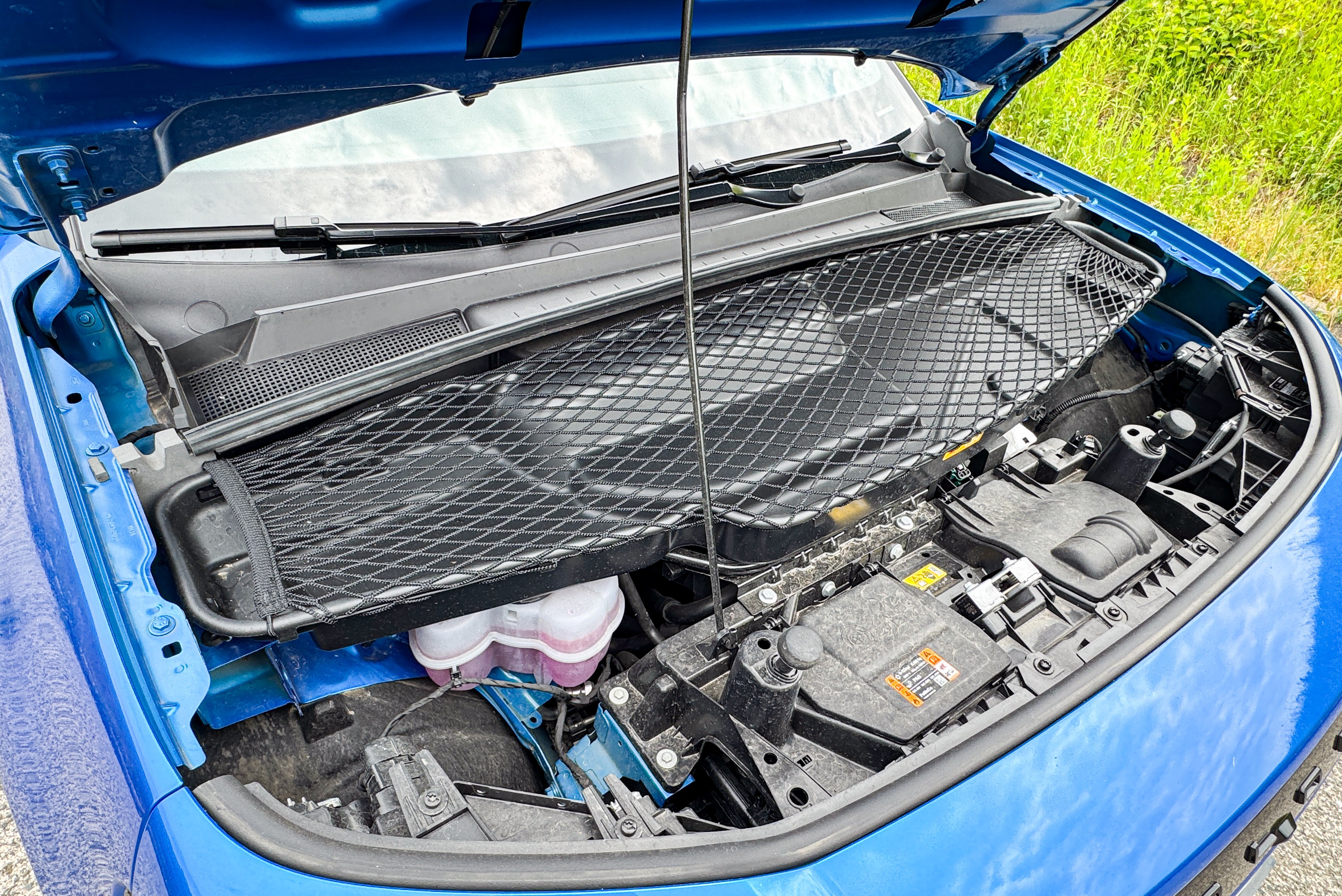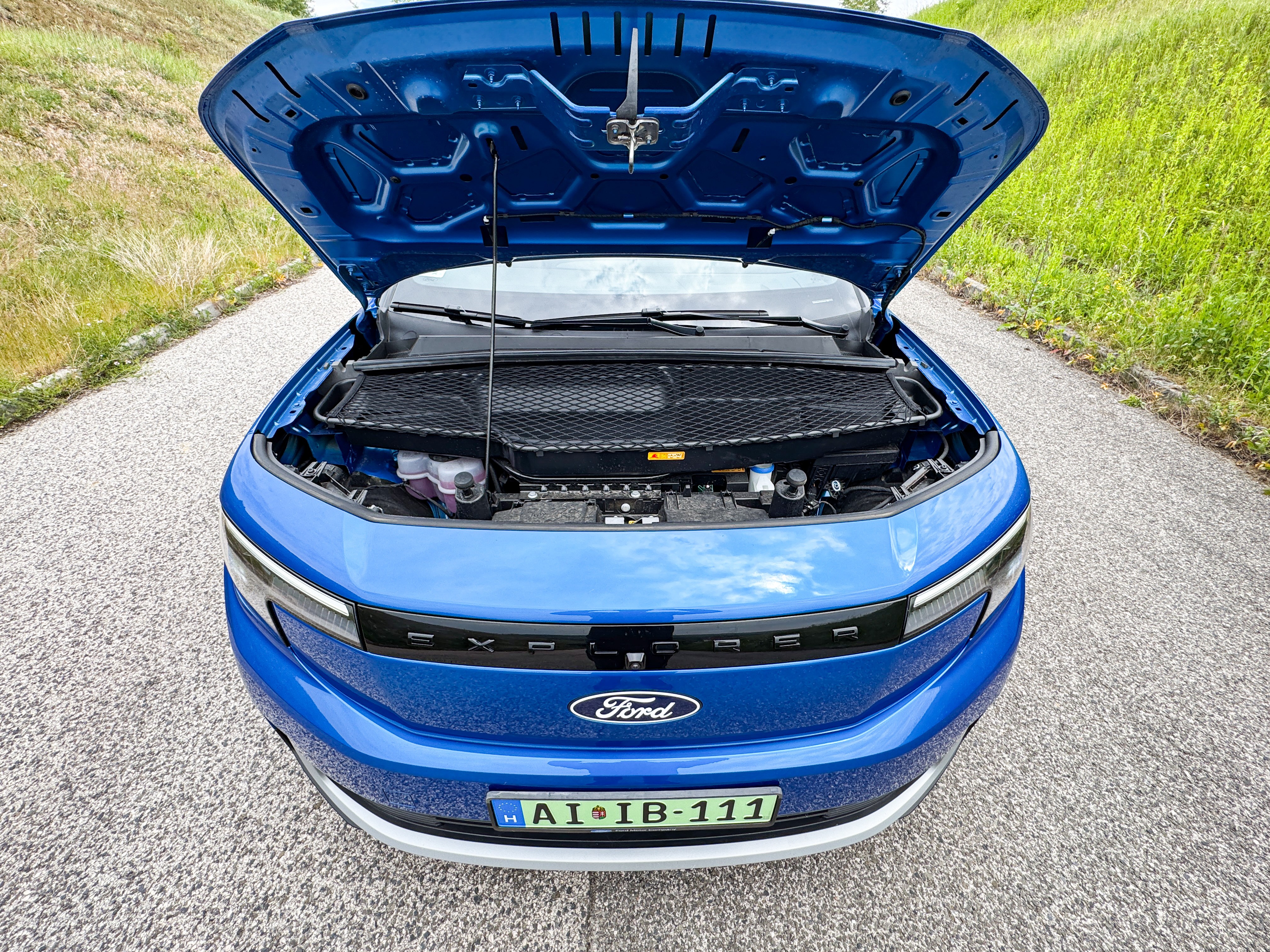 Az elektromos platformnak köszönhetően az Explorer Extended Range-nél elől is találunk egy kisebb csomagtartót (frunk), ami hálóval ellátott tálcaként funkcionál. Ilyet a platform társak esetében még nem láttam. Ez a megoldás kifejezetten praktikus, hiszen könnyen elhelyezhetünk benne nedves vagy piszkos tárgyakat anélkül, hogy összekenné a többi holmit, valamint dedikált helyet biztosít a töltőkábeleknek.
