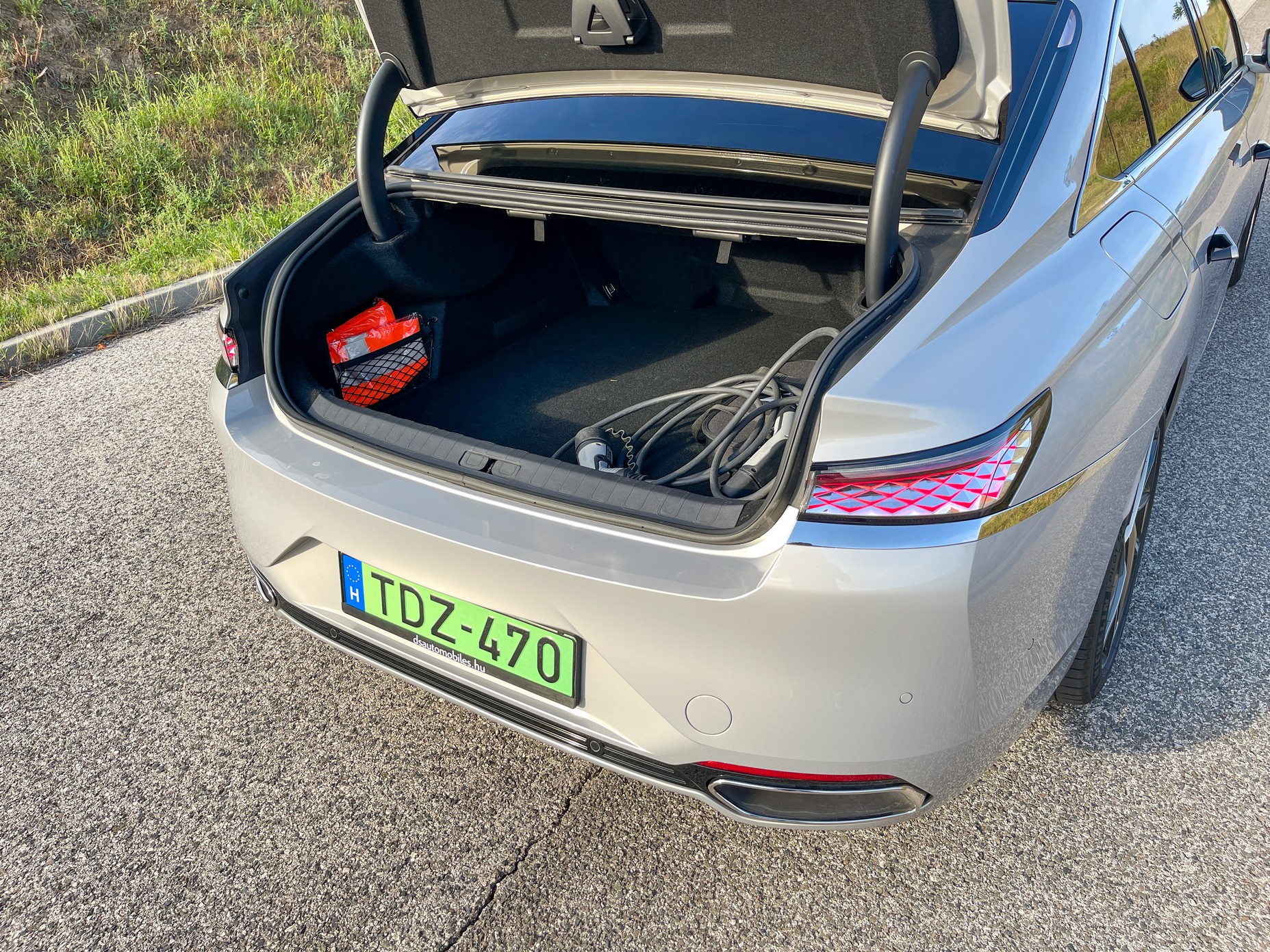 A hátsó lábtér mérete nem csökkenti a csomagteret jelentősen, hiszen a DS 9-nek 510 literes a csomagtere alaphelyzetben, amely természetesen tovább bővíthető az ülések lehajtásával. Viszont ezt sajnos nem lehet megosztani és nem is lesz teljesen sík a felület. Láthatóan nem a csomag szállítása volt a fő fókuszban a tervezéskor.