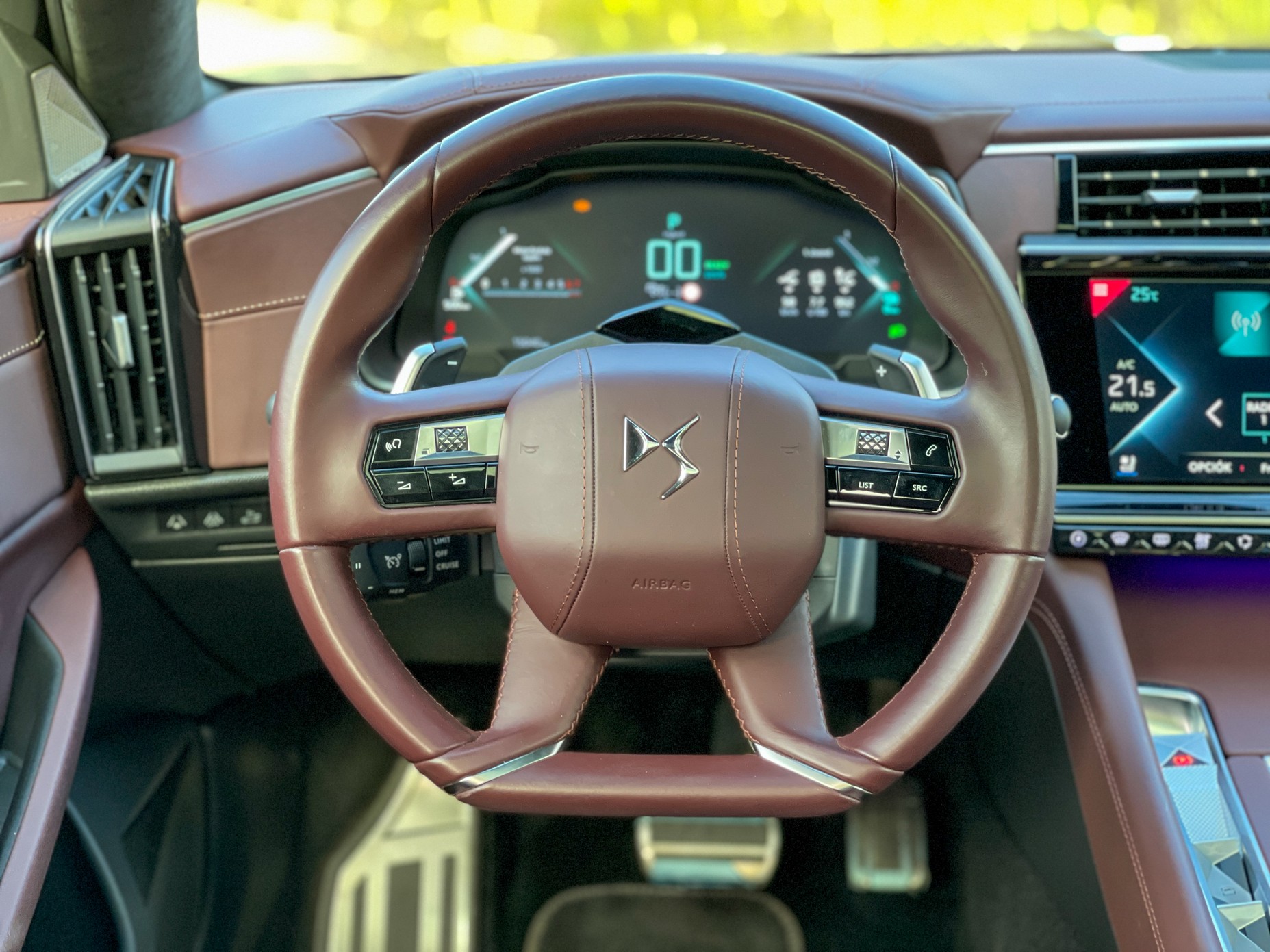 A műszerfal egy 12,3” -es digitális kijelző, teljesen egyedi DS hangulatú grafikával. A 10” -es érintőképernyős infotainement még az előző generációs, kicsit lassú szoftverrel van ellátva. Nem találom a leglogikusabbnak a felépítését, de használható. Az viszont egészen érthetetlen, hogy miért nem fért bele az egyébként rendkívül bőséges felszereltségű modell tartozékai közé egy jobb minőségű tolatókamera. Ez a felbontás 2022-ben már kellemetlen. Persze az ilyen apróságok inkább kötözködések, mert a többi részletre szinte mindenhol komolyan odatették magukat a franciák, hogy kifinomult, szép és modern legyen.