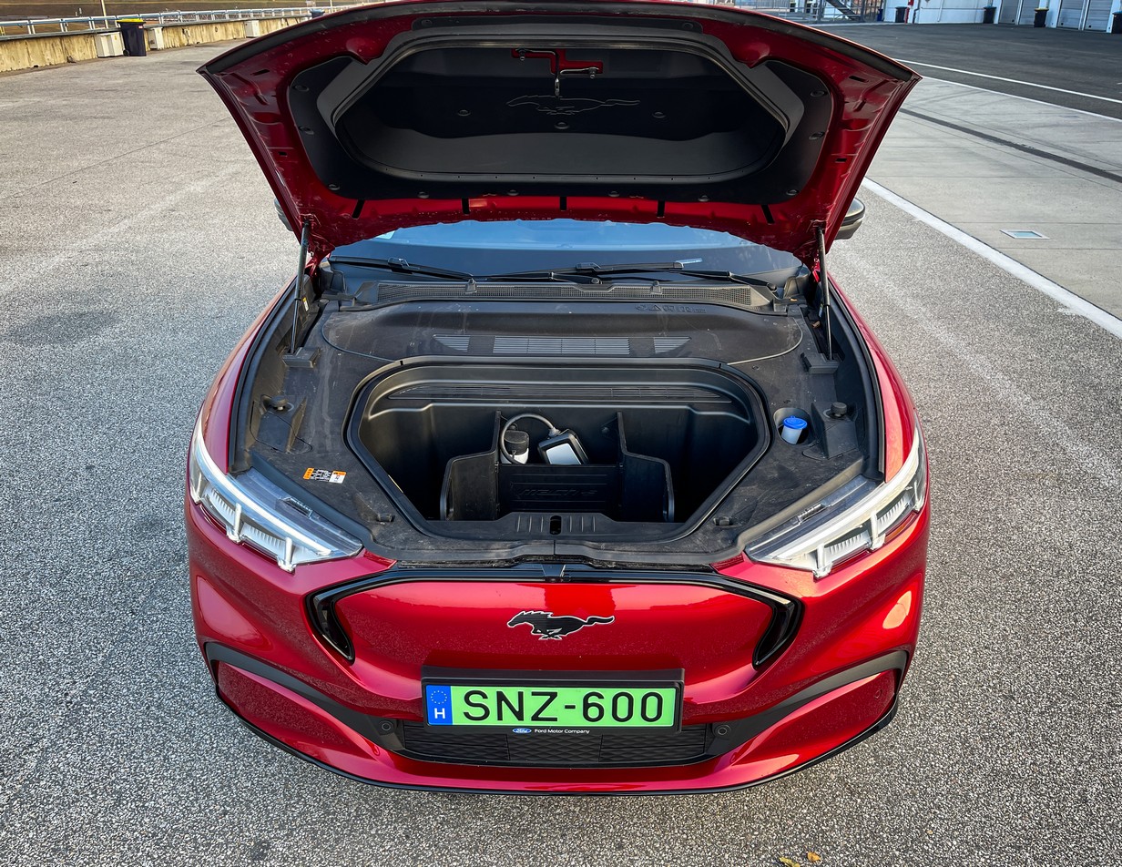 A tér egyébként kifejezetten tágas az elektromos Mustang belsejében. A SUV forma előnye, hogy a fejtér is tágas elől. Hátul kevésbé, mert előbbi előnyt felülírja a sportos vonalvezetés, ami miatt itt a tetősík alacsonyabban halad. De összeségében határozottan jó a belső méret és hangulat. A vörös cérnával varrt ülések jól néznek ki, talán egyetlen hátrányuk, hogy az oldaltartásuk nem elegendő.