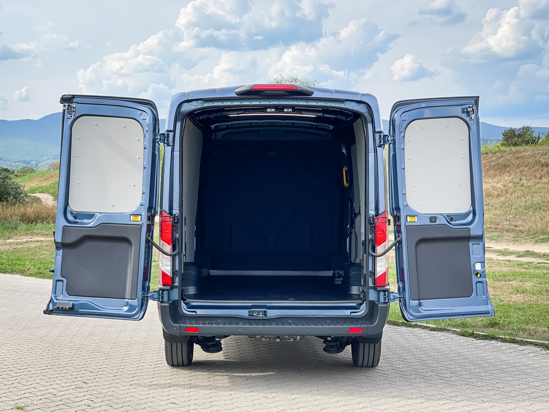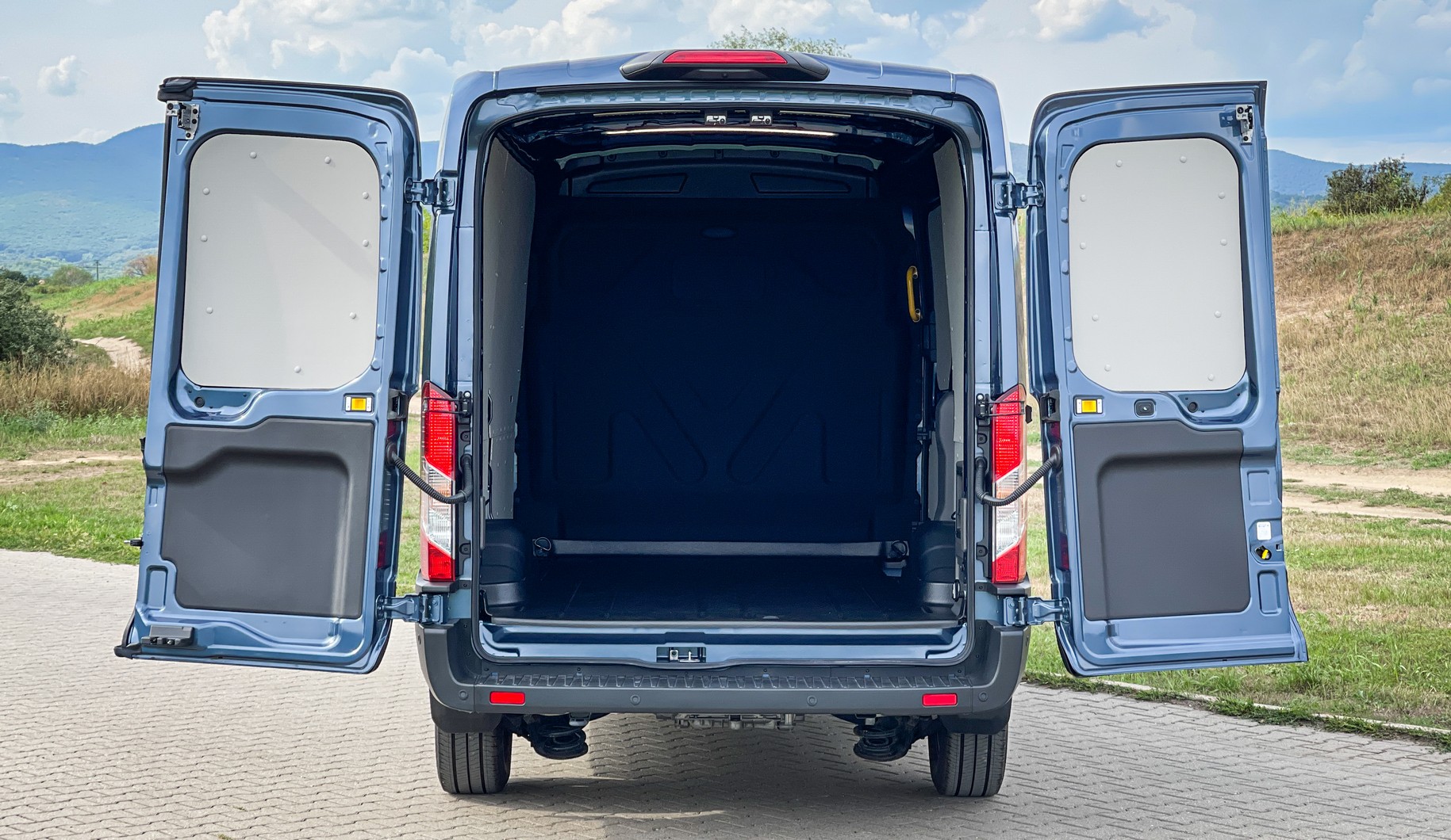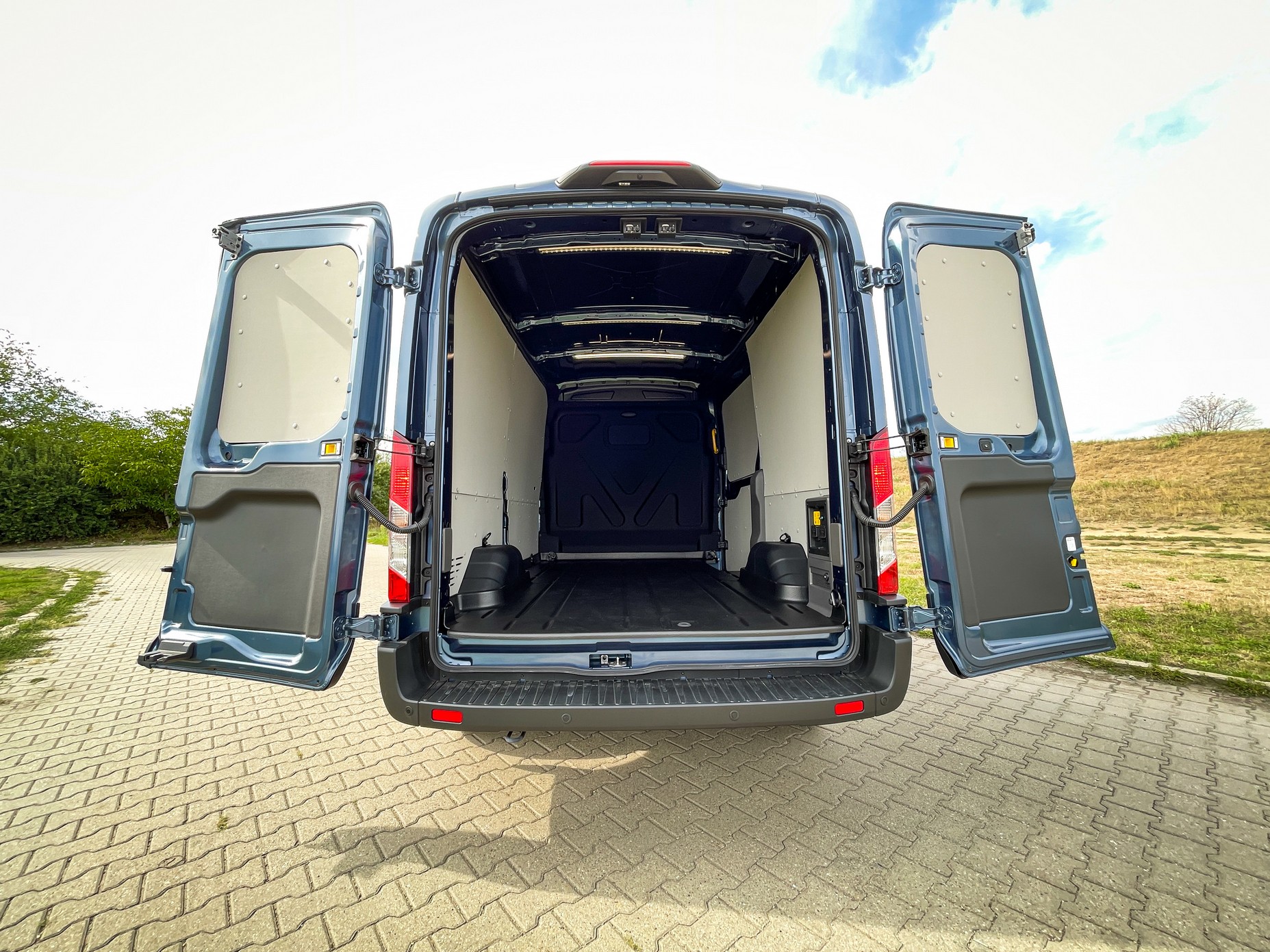 A méretes és igényesen burkolt raktérben (az L2H2 változatot teszteltük, tehát a legkisebb verziót) is akkora a hely, hogy ki lehet benne egyenesedni. Egyébként 3m hosszúsággal és 3m magassággal lesz elérhető a modell. A raktérben 2, az utastérben 1 darab 220V-os aljzatot is elhelyeztek, amely a Pro Power Onboard opció néven fut. Ezek a kimenetek a 68kW-os akkuból táplálkoznak és akár 2,3kW -ot is képesek szolgáltatni bármilyen eszköz részére, amire szüksége van a felhasználónak.