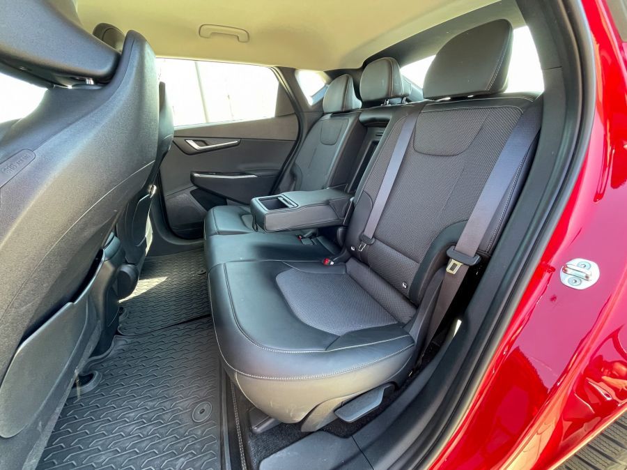 A hátsó utasok számára, ahogy imént említettem, fejedelmi tér lett kialakítva. Az üléspozíció talán nem a legjobb, mert a lábakat nem támasztja alá tökéletesen az ülés. Ennek oka, hogy a padlószint magasabban van, mivel alatta található az akkumulátor. Éppen ezért az üléseket kénytelenek voltak a tervezők alacsonyabban tartani az átlagosnál, hogy a fejtér megmaradjon. Nem kritikus a helyzet, kényelmes így is. A hátsó ülések háttámlája egyébként állítható dölésszögű. Ez szintén nagyon pozitív. Az itteni utasok is kaptak USB kimeneteket, szóval ebben sincs hiány.