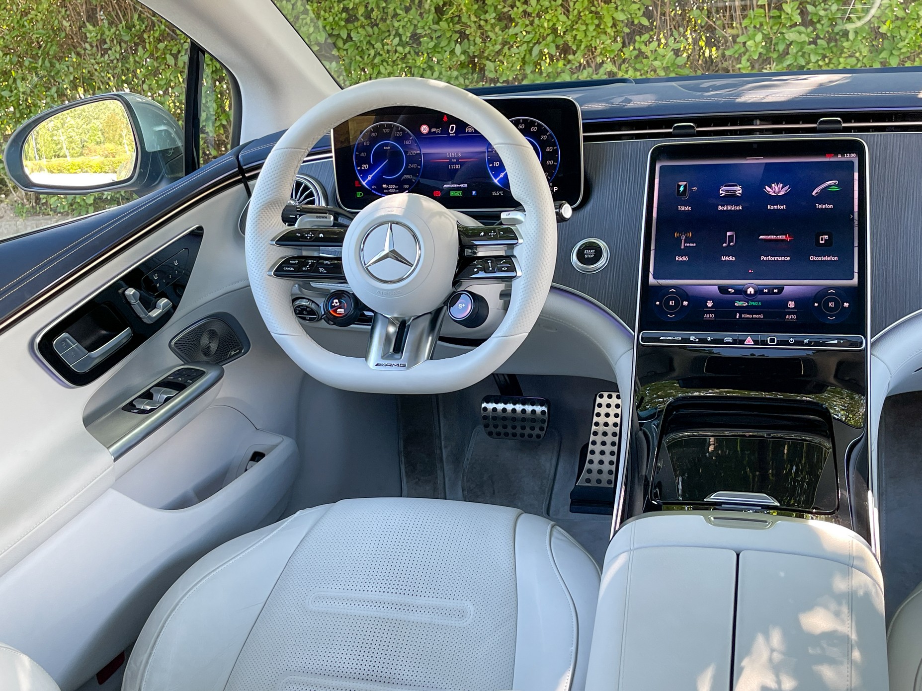 A komfort és a hangulat viszont hasonló az EQE-ben, mint a nagytestvérben. Árnyalatnyi különbség van a menetzaj területén, illetve a tesztautóban nem volt masszázsfunkció, míg az EQS-ben igen, de ez is csak extra kérdése és pótolható.