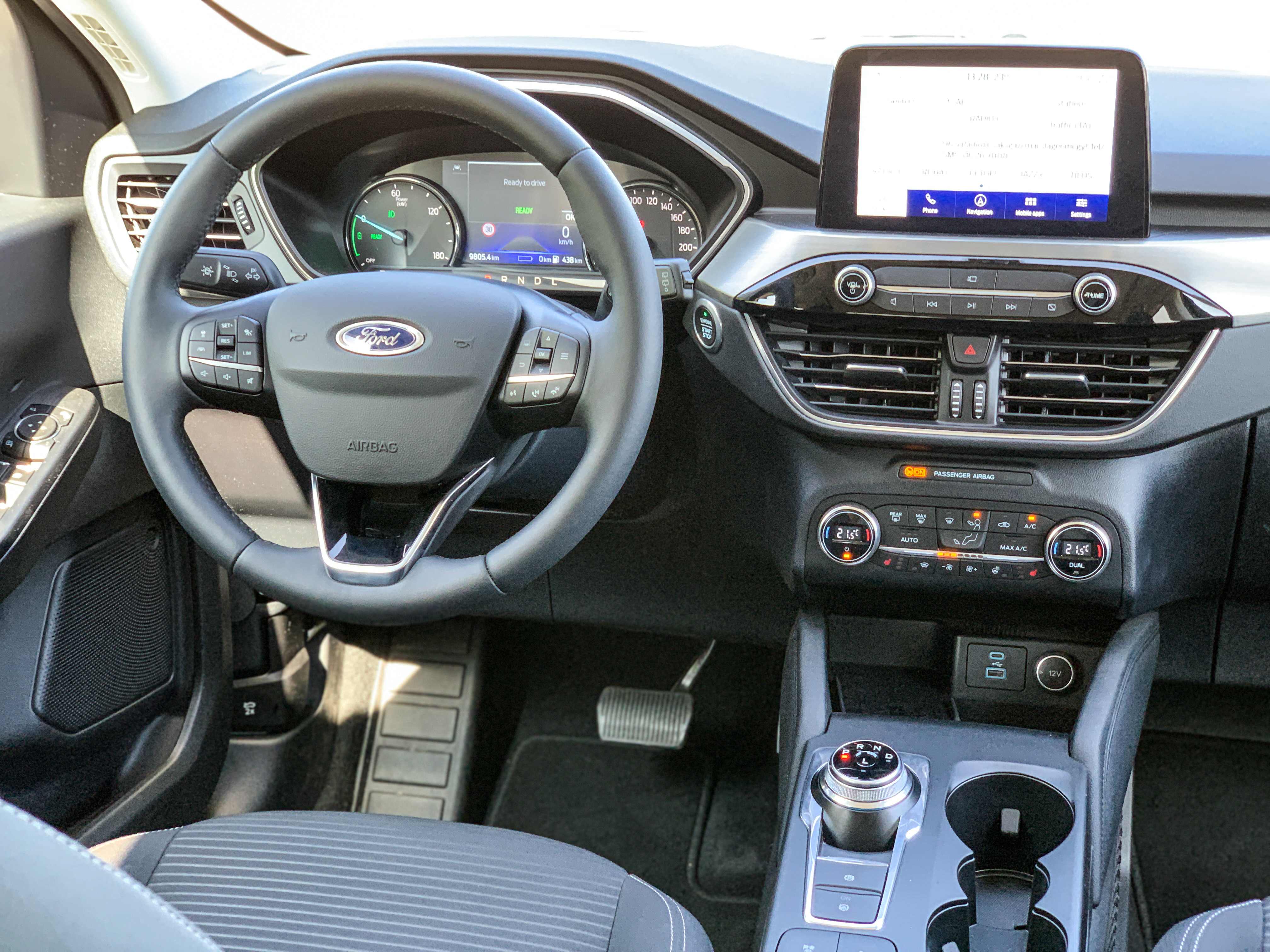 A műszeregységek, így a középkonzol tetején elhelyezett képernyő kezelése is egyszerű. A menü rendszer gyors, könnyen átlátható és támogatja az Apple CarPlayt is. A 8” -es képernyő a vezető felé van kicsit döntve, így kifejezetten kényelmes a használata. Nagyon tetszett, hogy a fokozatváltó egy tárcsává alakult. Nem foglal el helyet, kifejezetten egyszerű a kezelése. Összeségében elmondható, hogy otthonosan érzi magát az ember a Kuga belsejében.